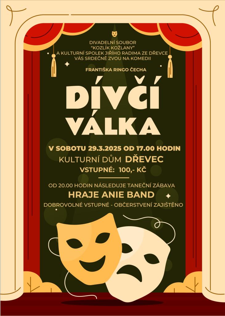zve divadelní soubor Kozlík Kožlany a Kulturní spolek Jiřího Radima ze Dřevce. Po představení od 20.00 hod. následuje taneční zábava, hraje hudební skupina Anie Band.