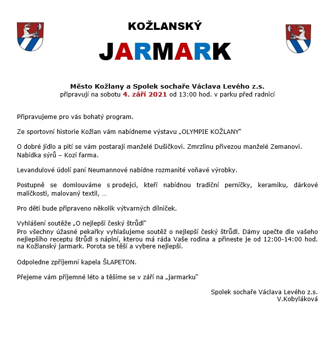 Pro všechny úžasné pekařky vyhlašujeme soutěž o nejlepší český štrůdl. Dámy upečte dle vašeho nejlepšího receptu štrůdl s náplní, kterou má ráda Vaše rodina a přineste je od 12:00-14:00 hod. na Kožlanský jarmark. Porota se těší a vybere nejlepší.