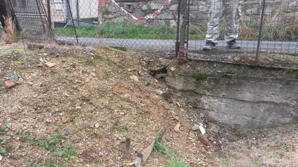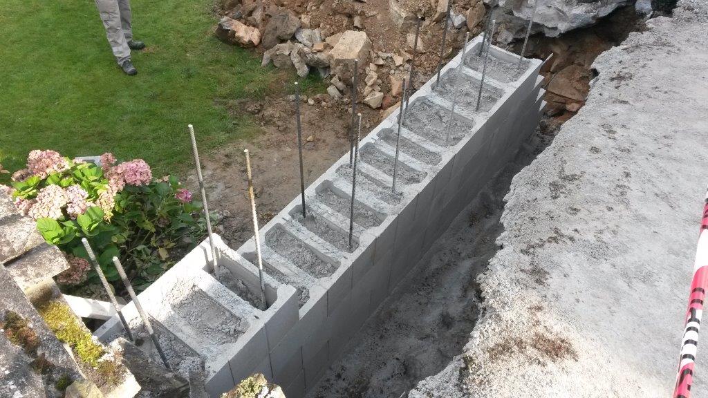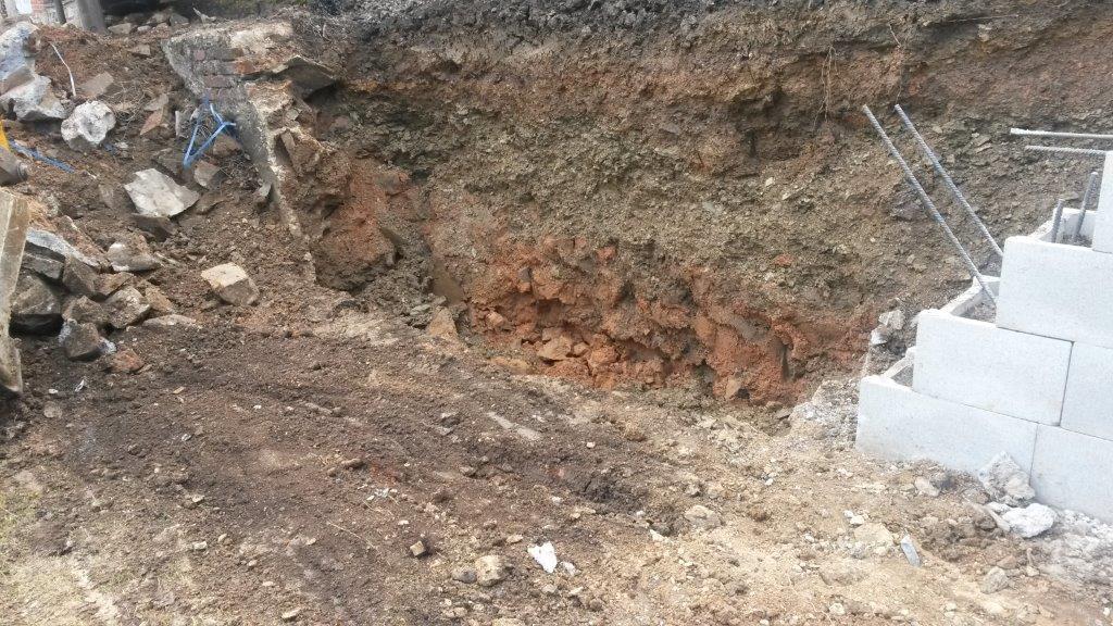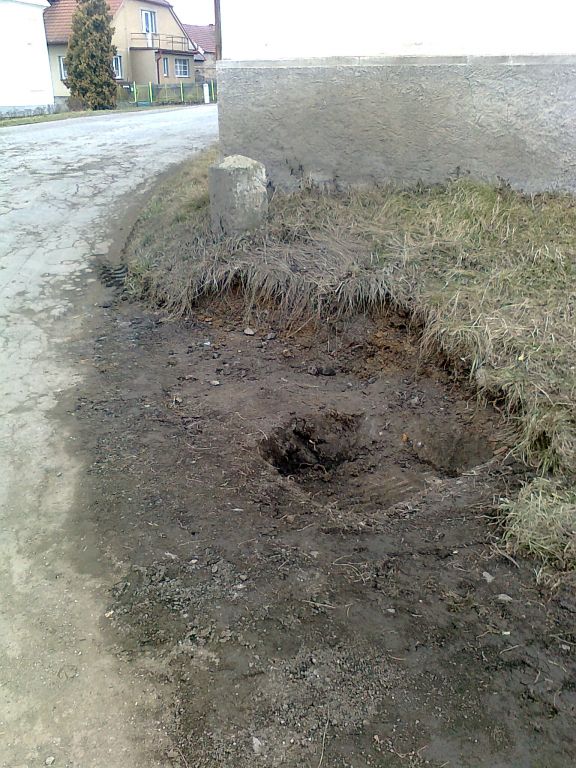 Oprava opěrné zdi v ulici Spojovací, Kožlany. Provádí firma Touš, Vysoká Libyně.